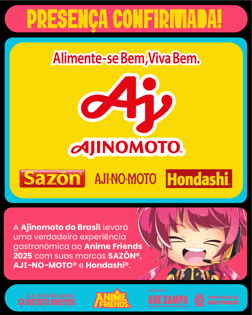 Reconhecida por sua tradição e inovação no setor de alimentos, a empresa promoverá ações que reforçam sua forte ligação com a cultura japonesa e com os fãs brasileiros. O “Momento Ajinomoto”, uma deliciosa degustação de yakisoba com o tempero HONDASHI® que acontecerá nos principais palcos do festival, este ano, será acompanhado da marca AJI-NO-MOTO®, que por sua vez, levará ao público a degustação de um irresistível caldinho de feijão com um toque único do realçador de sabor. Além disso, como uma das marcas patrocinadoras do evento, SAZÓN®, com o Tempero SAZÓN® para Pipoca sabor Manteiga, será a pipoca oficial do Anime Friends 2025, onde o consumidor poderá ganhar um balde exclusivo e personalizado da marca.