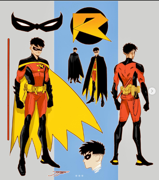 Jorge Jiménez, responsável pela arte, compartilhou em suas redes sociais uma arte conceitual do novo uniforme. “O vermelho está de volta ao nosso Tim!”, escreveu o artista. O design mostra o traje frontal e traseiro, insígnia, máscara, bastão e capa, combinando tons de vermelho com preto, e uma capa amarela clássica — visual que remete ao uniforme usado por Tim no arco “One Year Later”.
