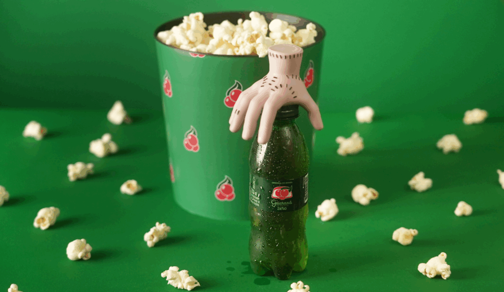 O brinde escolhido é o personagem Mãozinha, de Wandinha, conectado ao clássico jingle “Pipoca & Guaraná”. A ação resgata a memória das caçulinhas com brindes colecionáveis, sucesso nos anos 2000, e ganha força com latinhas temáticas inspiradas na série, disponíveis em capitais e no Zé Delivery.