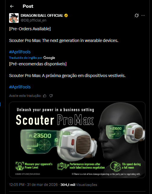 A franquia divulgou nas redes sociais um suposto produto chamado “Scouter ProMax”, uma versão “real” do famoso aparelho usado pelos guerreiros para medir níveis de poder. Na descrição, o gadget prometia funções absurdas e divertidas, como analisar a força de oponentes, melhorar desempenho após negociações fracassadas e até alcançar “velocidade 10x durante a lua cheia”.